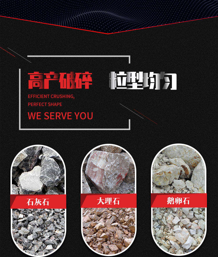 适用物料: 石灰石、河卵石、花岗岩、玄武岩、白云石、煤矸石等。
